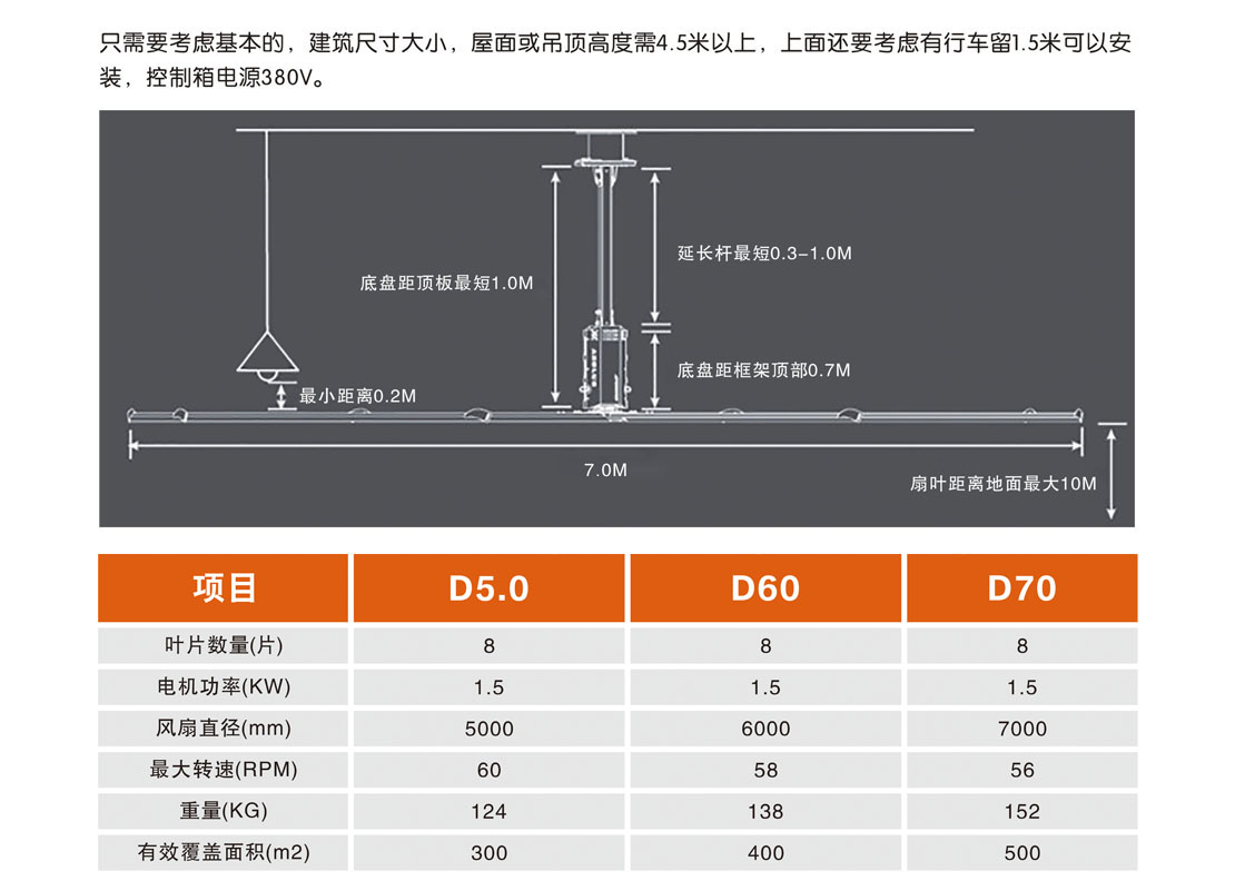 大型工業(yè)吊扇直徑達(dá)5-7米,功率為1.5千瓦,風(fēng)力柔和、無(wú)噪音,能滿足200-500平方米的室內(nèi)降溫、通風(fēng)等要求。